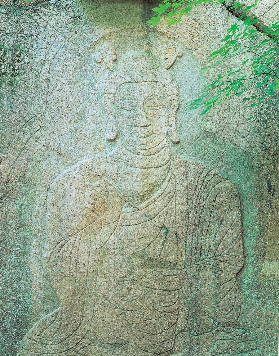 위로 가기마애여래좌상은 대승사로부터 약 2km 떨어진 지점으로, 윤필암 못 가서 왼쪽으로 묘적암 가는 길이 나 있는데 중간지점쯤 바위에 새겨진 것이다. 조각 기법은 양각과 음각으로 새겨서 조성된 것으로 위쪽과 아래쪽에 균열이 생겼으나, 보존상태는 양호하며 마애불의 크기는 높이 약 6m, 어깨 너비 약 2.2m, 무릎 너비 3.1m이며, 연화대좌(蓮華臺坐)의 높이는 1.3m, 너비는 3.7m로 화강석의 자연석벽을 이용하여 음각된 이중연화좌(二重蓮華座) 위에 신광(身光)과 두광(頭光)을 역시 음각하였으며, 머리 위로는 모서리가 깨어진 평편한 판석이 앞으로 밀려나와 있는 것으로 보아 천개(天蓋) 형식의 판석을 별석(別石)으로 마련했던 것으로 추정된다.